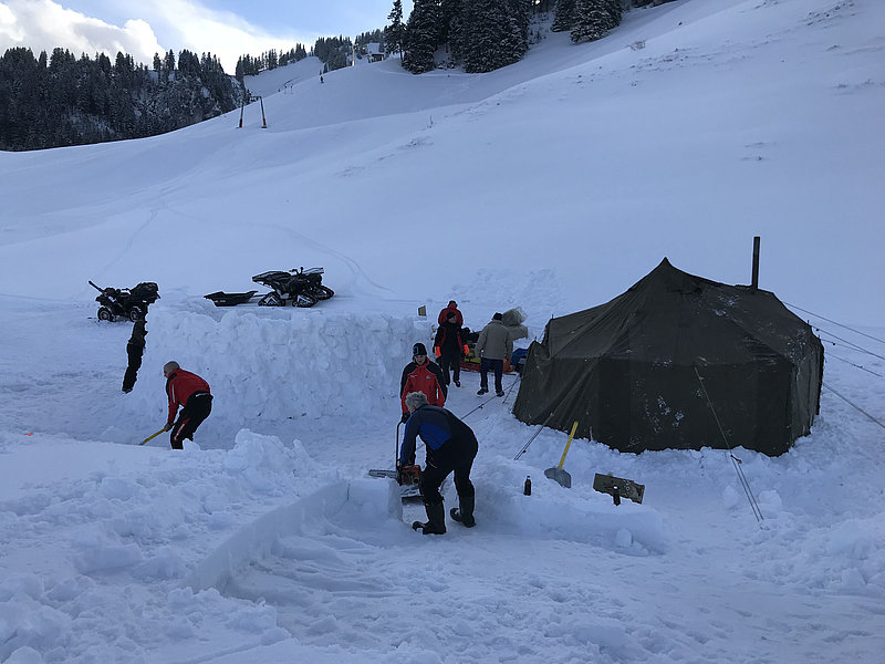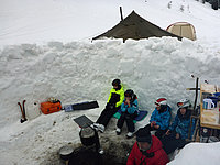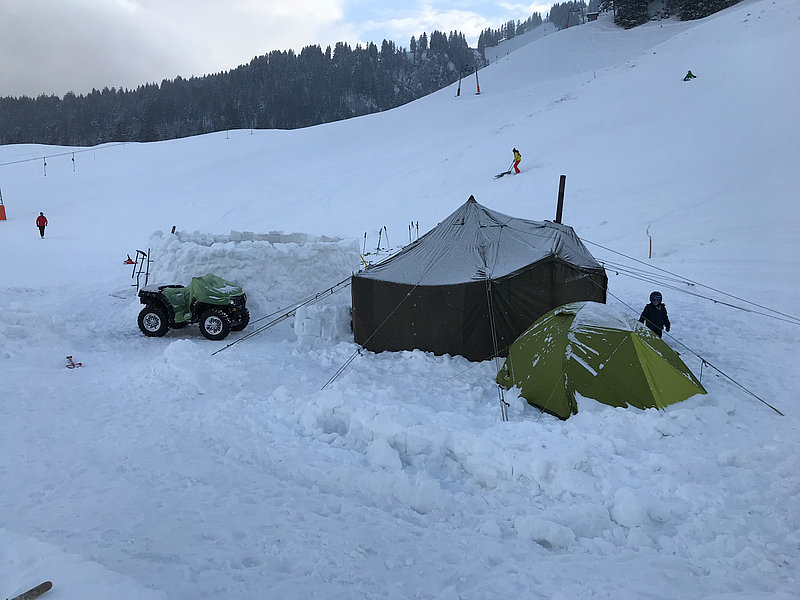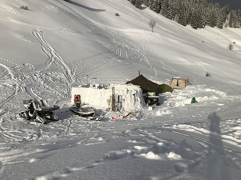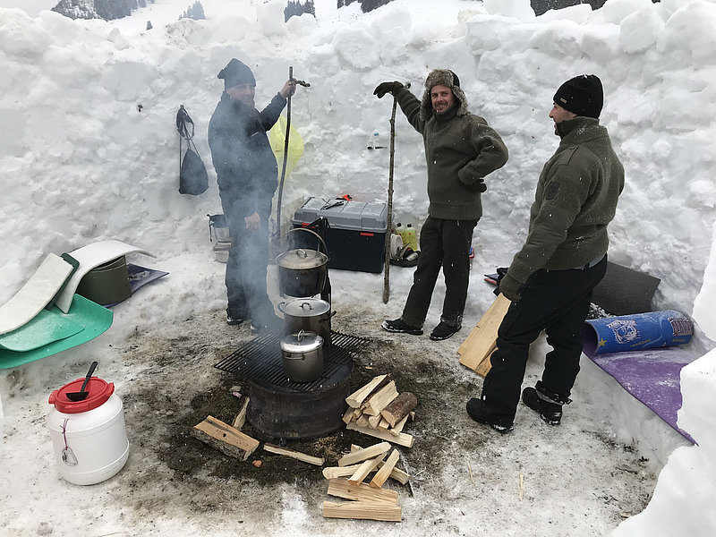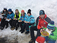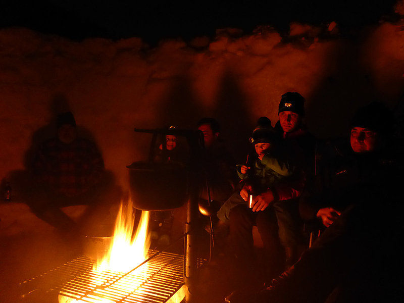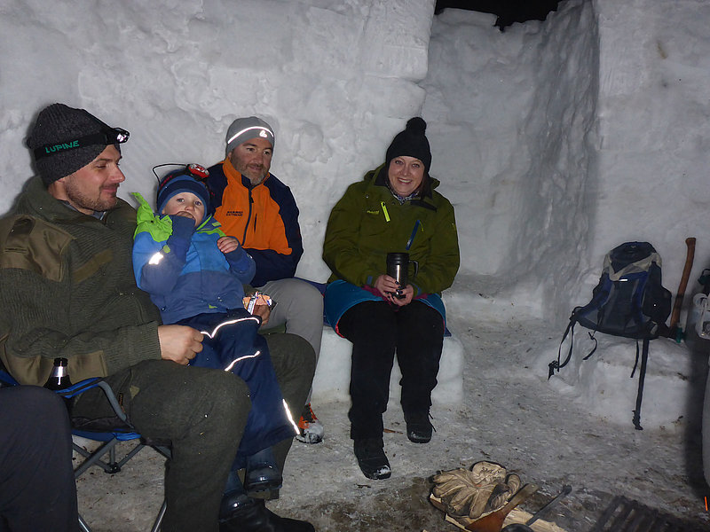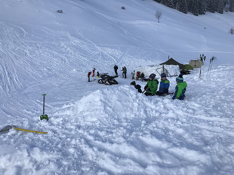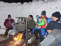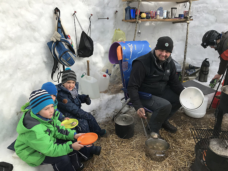 Neunzehn Personen mit Nahrung und Getränken zu versorgen ist neben der logistischen Herausforderung auch eine zeitliche. Da wir nicht nur die Herdplatte einschalten können um zu kochen sondern die Abläufe wohl überlegen müssen. Wir kochen am offenen Feuer und das hat so seine Tücken. Einmal ist es zu klein einmal zu groß und vor allem will es permanent gefüttert werden. Doch was wäre ein Wintercamp wenn alles einfach wäre und bekanntlich wächst man mit der Herausforderung. So konnten wir, wenn auch nicht immer zur gewünschten Zeit, alle Mäuler stopfen. Eine erfrischende Abwechslung und Entlastung der Küchencrew brachte da die Versorgung durch Maria Helene Aberer die uns an einem Tag mit Leberknödelsuppe und Apfelküchle versorgte. Es ist kaum zu glauben wie wenig Kinder brauchen um glücklich zu sein. Keine Spur von Mobiltelefon oder Computerspiel, eine Schaufel ein wenig Schnee und die Tage haben zu wenig Stunden um alles was gemacht werden soll fertig zu bekommen. Unzählige Höhlen, Rutschbahnen und Schneeburgen wurden von unseren kleinen Gästen gebaut. Dabei wurden sie natürlich auch von ihren Vätern tatkräftig unterstützt und manchmal war die Grenze zwischen Kind und Erwachsenem nicht mehr deutlich zu erkennen. Am Abend waren die kleinen und großen Campbewohner dann dementsprechend müde und schon früh wurden die Lichter gelöscht und wir verkrochen uns in unsere Schlafsäcke. Wie jedes Jahr, so stellten sich auch heuer wieder viele Besucher bei uns ein um sich zu überzeugen, dass es uns gut geht oder aber einfach um mit uns gemeinsam einige unbeschwerte Stunden zu verbringen. Es versteht sich von selbst, dass diese Besucher von uns nach besten Kräften bewirtet wurden und wir versucht haben ihnen den Besuch so angenehm wie möglich zu gestalten. Ich denke ich spreche für uns alle, wenn ich sage es war für jeden etwas dabei und wir waren ein gutes Team. Denn nur gemeinsam ist ein solches Unternehmen zu bewerkstelligen. Es bleibt mir nunmehr nur noch Danke zu sagen. Danke dem Alpenverein Hohenems und der Stadt Hohenems die uns finanziell unterstützen, danke der Bergrettung Hohenems deren Mitglieder uns durch ihre Arbeitskraft unterstützen aber auch danke an die Alpgemeinschaft und die gräfliche Forstverwaltung für den Platz auf dem wir das Camp immer wieder machen können. Ebenso Danke der Firma Klien die uns ein Schneemobil zur Verfügung stellt damit wir den mühsamen Materialtransport leichter bewerkstelligen können. Nicht zu vergessen der Skiverein Schuttannen der so manches Mal ein Auge zudrückt wenn wir nicht alle Regeln befolgen. Das Miteinander in der Schuttanne hat bereits eine lange Tradition und dadurch sind Dinge wie das Wintercamp des Alpenverein Hohenems erst möglich.