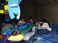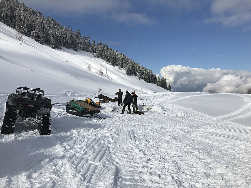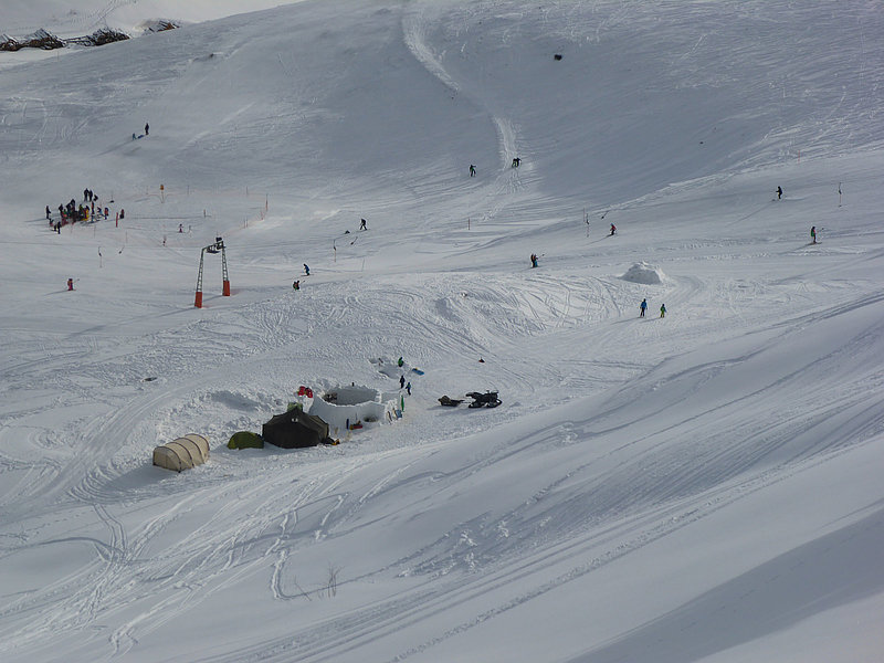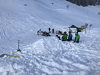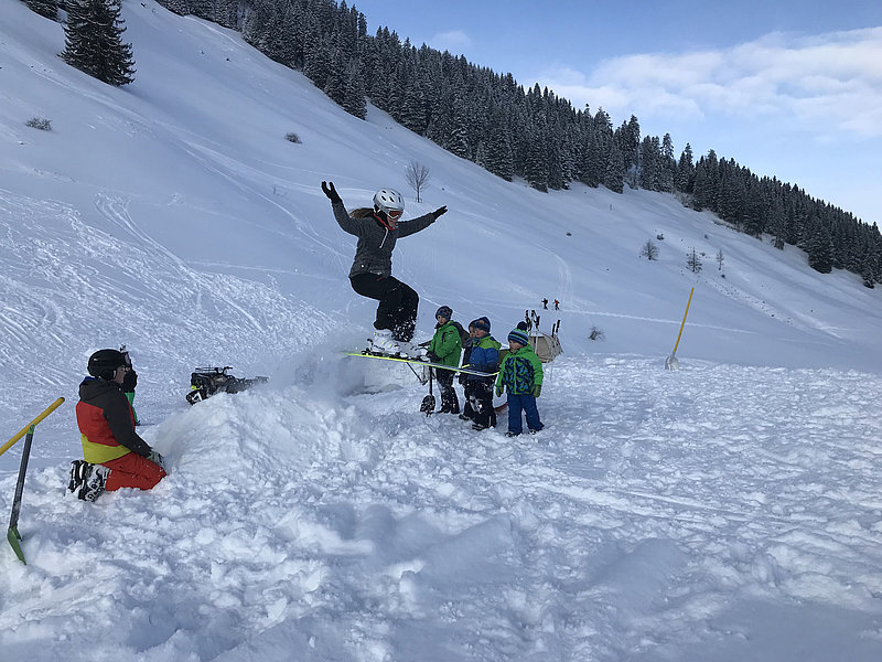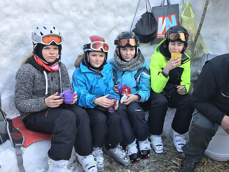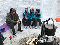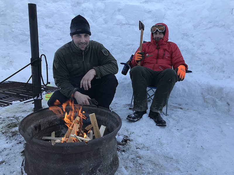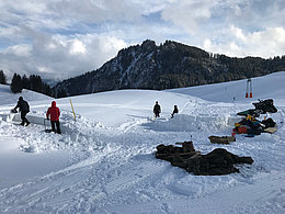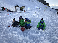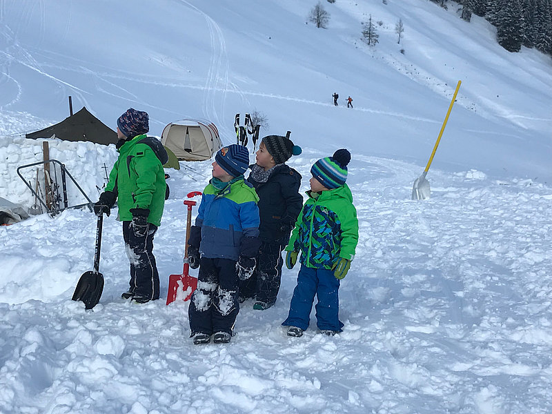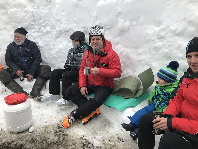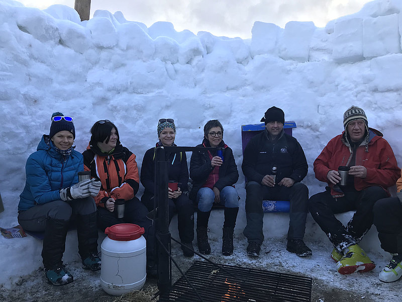 Neunzehn Personen mit Nahrung und Getränken zu versorgen ist neben der logistischen Herausforderung auch eine zeitliche. Da wir nicht nur die Herdplatte einschalten können um zu kochen sondern die Abläufe wohl überlegen müssen. Wir kochen am offenen Feuer und das hat so seine Tücken. Einmal ist es zu klein einmal zu groß und vor allem will es permanent gefüttert werden. Doch was wäre ein Wintercamp wenn alles einfach wäre und bekanntlich wächst man mit der Herausforderung. So konnten wir, wenn auch nicht immer zur gewünschten Zeit, alle Mäuler stopfen. Eine erfrischende Abwechslung und Entlastung der Küchencrew brachte da die Versorgung durch Maria Helene Aberer die uns an einem Tag mit Leberknödelsuppe und Apfelküchle versorgte. Es ist kaum zu glauben wie wenig Kinder brauchen um glücklich zu sein. Keine Spur von Mobiltelefon oder Computerspiel, eine Schaufel ein wenig Schnee und die Tage haben zu wenig Stunden um alles was gemacht werden soll fertig zu bekommen. Unzählige Höhlen, Rutschbahnen und Schneeburgen wurden von unseren kleinen Gästen gebaut. Dabei wurden sie natürlich auch von ihren Vätern tatkräftig unterstützt und manchmal war die Grenze zwischen Kind und Erwachsenem nicht mehr deutlich zu erkennen. Am Abend waren die kleinen und großen Campbewohner dann dementsprechend müde und schon früh wurden die Lichter gelöscht und wir verkrochen uns in unsere Schlafsäcke. Wie jedes Jahr, so stellten sich auch heuer wieder viele Besucher bei uns ein um sich zu überzeugen, dass es uns gut geht oder aber einfach um mit uns gemeinsam einige unbeschwerte Stunden zu verbringen. Es versteht sich von selbst, dass diese Besucher von uns nach besten Kräften bewirtet wurden und wir versucht haben ihnen den Besuch so angenehm wie möglich zu gestalten. Ich denke ich spreche für uns alle, wenn ich sage es war für jeden etwas dabei und wir waren ein gutes Team. Denn nur gemeinsam ist ein solches Unternehmen zu bewerkstelligen. Es bleibt mir nunmehr nur noch Danke zu sagen. Danke dem Alpenverein Hohenems und der Stadt Hohenems die uns finanziell unterstützen, danke der Bergrettung Hohenems deren Mitglieder uns durch ihre Arbeitskraft unterstützen aber auch danke an die Alpgemeinschaft und die gräfliche Forstverwaltung für den Platz auf dem wir das Camp immer wieder machen können. Ebenso Danke der Firma Klien die uns ein Schneemobil zur Verfügung stellt damit wir den mühsamen Materialtransport leichter bewerkstelligen können. Nicht zu vergessen der Skiverein Schuttannen der so manches Mal ein Auge zudrückt wenn wir nicht alle Regeln befolgen. Das Miteinander in der Schuttanne hat bereits eine lange Tradition und dadurch sind Dinge wie das Wintercamp des Alpenverein Hohenems erst möglich.
